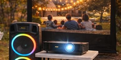 Includes projector, large screen, and speaker for a full backyard movie experience.